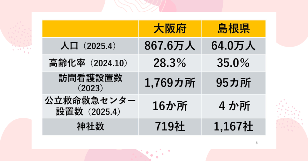 また、大都市と過疎地では高齢化率や訪問看護の数、文化や産業も大きく異なります。